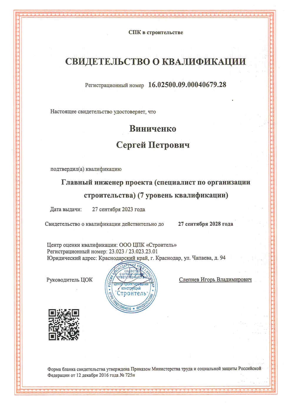 Главный инженер ООО «Кубань Инновация» Виниченко Сергей Петрович успешно сдал экзамен и подтвердил квалификацию 7-го уровня «Главный инженер проекта (специалист по организации строительства)».